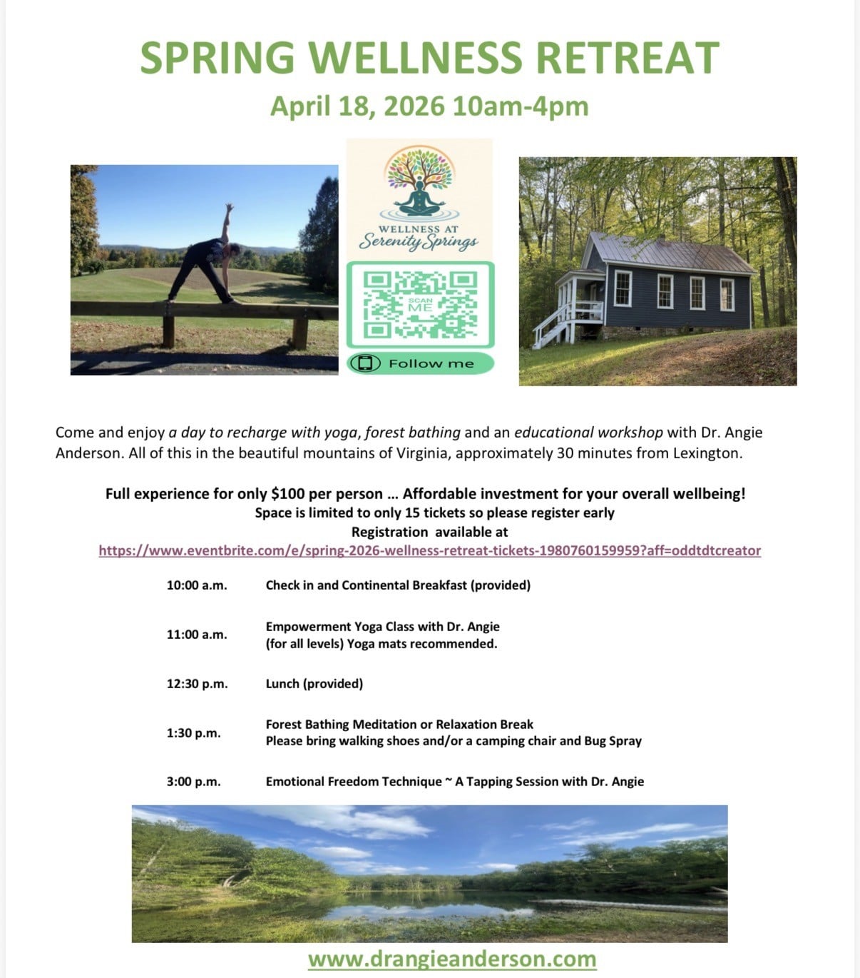 Come and enjoy a day to recharge with yoga, forest bathing and an educational workshop with Dr. Angie Anderson. All of this in the beautiful mountains of Virginia, approximately 30 […]